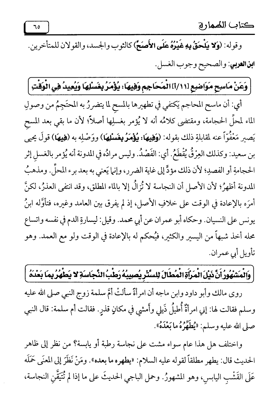 واختلف هل هذا عام سواء مشت على نجاسة رطبة أو يابسة؟ من نظر إلى ظاهر الحديث قال: يطهر مطلقاً لقوله عليه السلام: "يطهره ما بعده". ومَنْ نَظَرَ إلى المعنَى حَمَلَه عَلَى القَشْبِ اليابسِ، وهو الْمَشْهُورِ. وحمل الباجي الحديثَ على ما إذا لم تُتَيَقَّنِ النجاسة،