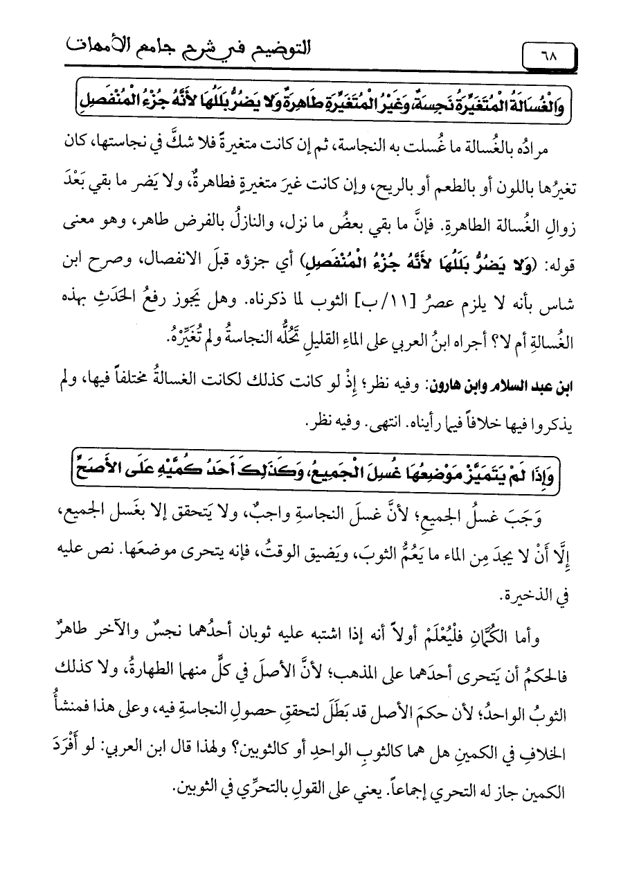 ابن عبد السلام وابن هارون: وفيه نظر؛ إِذْ لو كانت كذلك لكانت الغسالةُ مختلفاً فيها، ولم يذكروا فيها خلافاً فيما رأيناه. وفيه نظر.