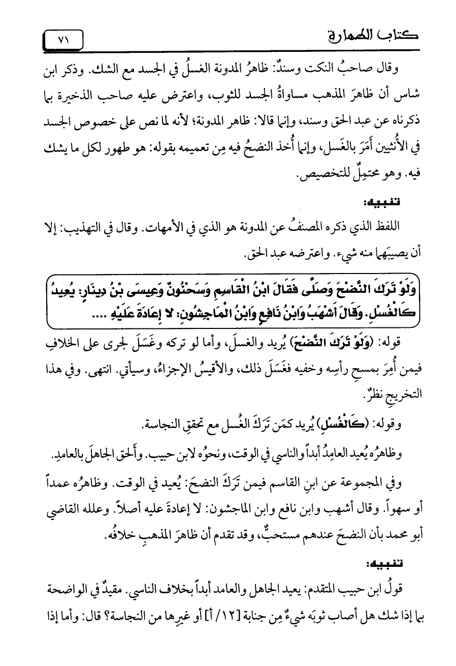 وَلَوْ تَرَكَ النَّضْحَ وَصَلَّى فَقَالَ ابْنُ الْقَاسِمِ وَسَحْنُونٌ وَعِيسَى بْنُ دِينَارٍ: يُعيد كَالْغُسْلِ. وَقَالَ أَشْهَبُ وَابْنُ نَافِعٍ وَابْنُ الْمَاجِشُونِ: لا إِعَادَةَ عَلَيْهِ ....