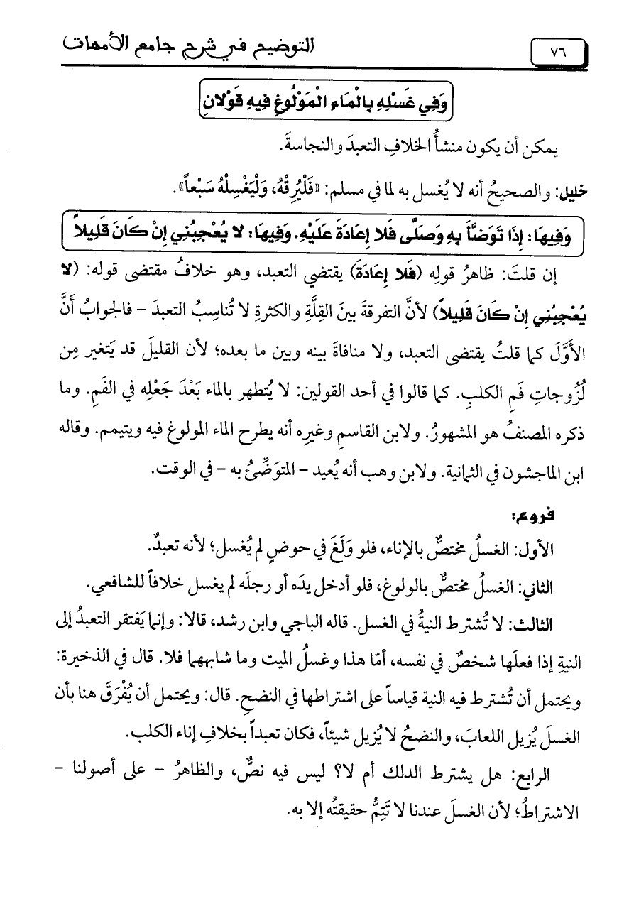 إن قلتَ: ظاهرُ قولِه (فَلا إِعَادَةَ) يقتضي التعبد، وهو خلافُ مقتضى قوله: (لا يُعْجِبُنِي إِنْ كَانَ قَلِيلاً) لأنَّ التفرقةَ بينَ القِلَّةِ والكثرةِ لا تُناسِبُ التعبدَ- فالجوابُ أَنَّ الأَوَّلَ كما قلتُ يقتضي التعبد، ولا منافاةَ بينه وبين ما بعده؛ لأن القليلَ قد يتَغير مِن لُزُوجاتِ فَمِ الكلبِ. كما قالوا في أحد القولين: لا يُتطهر بالماء بَعْدَ جَعْلِه في الفَمِ. وما ذكره المصنفُ هو الْمَشْهُورِ. ولابن القاسمِ وغيرِه أنه يطرح الماء الملوغ فيه ويتيمم. وقاله ابن الماجشون في الثمانية. ولابن وهب أنه يُعيد- المتوَضِّئُ به- في الوقت.