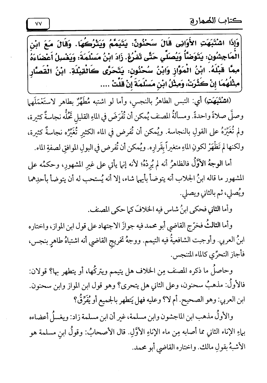 وَإِذَا اشْتَبَهَتِ الأَوَانِي قَالَ سَحْنُونٌ: يَتَيَمَّمُ وَيَتْرُكُهَا. وَقَالَ مَعَ ابْنِ المَاجِشُونِ: يَتَوَضَّأُ وَيُصَلِّي حَتَّى تَفْرُغَ. زَادَ ابْنُ مَسْلَمَةَ: وَيَغْسِلُ أَعْضَاءَهُ مِمَّا قَبْلَهُ. ابْنُ الْمَوَّازِ وَابْنُ سُحْنُونٍ: يَتَحَرَّى كَالْقِبْلَةِ. ابْنُ الْقَصَّارِ مِثلُهُمَا إِنْ كَثُرَتْ، وَمِثْلُ ابْنِ مَسْلَمَةَ إِنْ قَلَّتْ .....