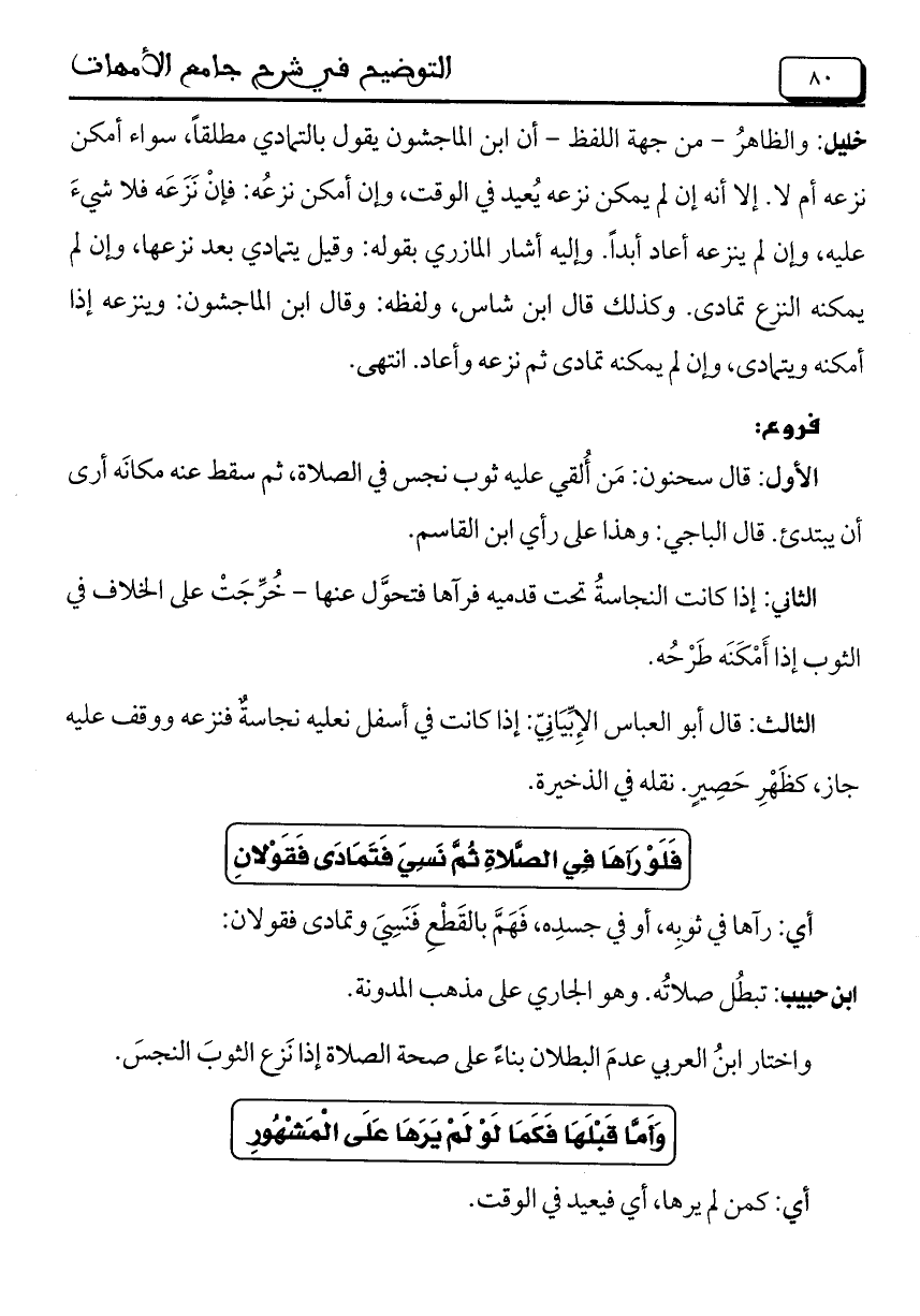 خليل: والظاهرُ- من جهة اللفظ- أن ابن الماجشون يقول بالتمادي مطلقاً، سواء أمكن نزعه أم لا. إلا أنه إن لم يمكن نزعه يُعيد في الوقت، وإن أمكن نزعُه: فإنْ نَزَعَه فلا شيءَ عليه، وإن لم ينزعه أعاد أبداً. وإليه أشار المازري بقوله: وقيل يتمادى بعد نزعها، وإن لم يمكنه النزع تمادى. وكذلك قال ابن شاس، ولفظه: وقال ابن الماجشون: وينزعه إذا أمكنه ويتمادى، وإن لم يمكنه تمادى ثم نزعه وأعاد. انتهى.