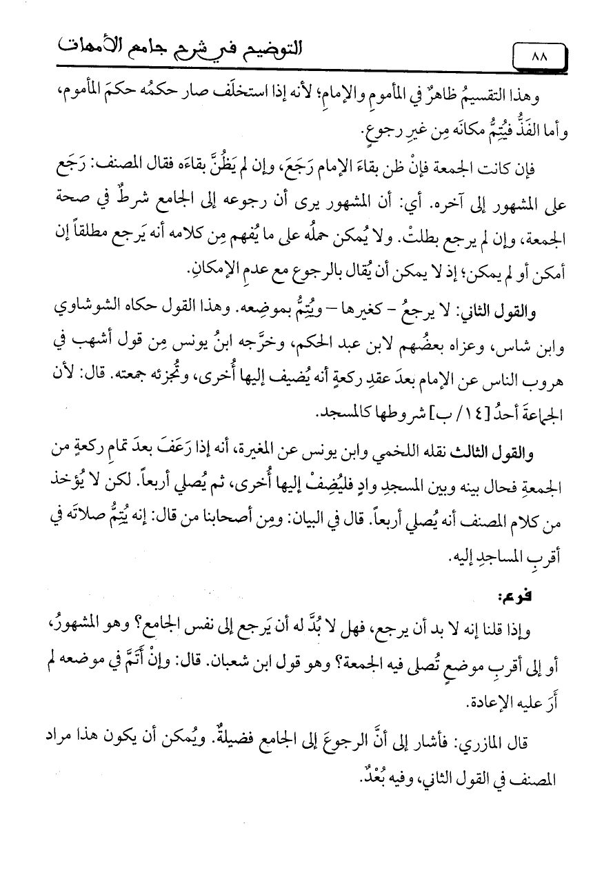 قال المازري: فأشار إلى أنَّ الرجوعَ إلى الجامع فضيلةٌ. ويُمكن أن يكون هذا مراد المصنف في القول الثاني، وفيه بُعْدٌ.