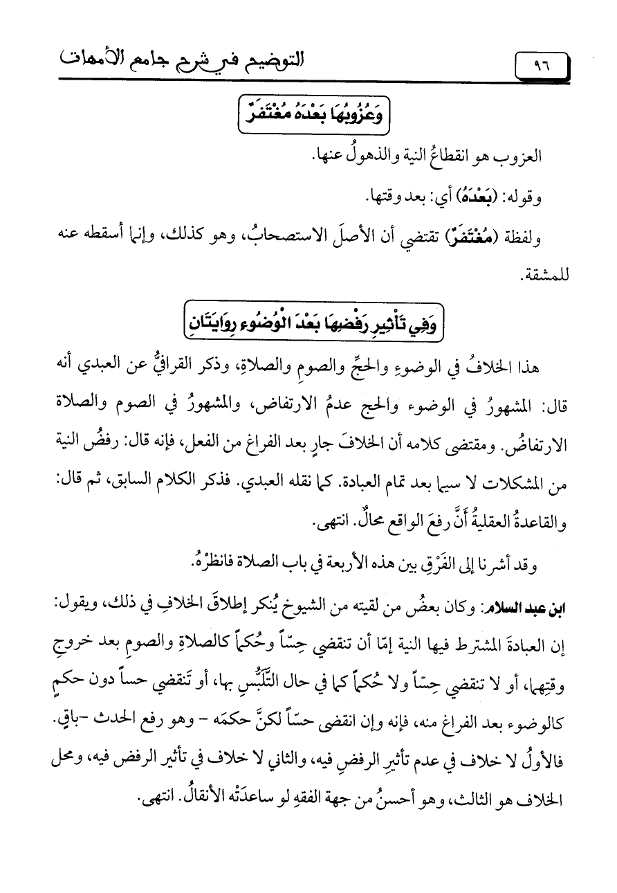 ابن عبد السلام: وكان بعضُ من لقيته من الشيوخ يُنكر إطلاقَ الخلافِ في ذلك، ويقول: إن العبادةَ المشترط فيها النية إمّا أن تنقضي حِسّاً وحُكماً كالصلاةِ والصومِ بعد خروجِ وقتِهما، أو لا تنقضي حِسّاً ولا حُكماً كما في حال التَّلبُّس بها، أو تَنقضي حساً دون حكمٍ كالوضوء بعد الفراغ منه، فإنه وإن انقضى حسّاً لكنَّ حكمَه– وهو رفع الحدث– باقٍ. فالأولُ لا خلاف في عدم تأثيرِ الرفضِ فيه، والثاني لا خلاف في تأثير الرفض فيه، ومحل الخلاف هو الثالث، وهو أحسنُ من جهة الفقهِ لو ساعدَتْه الأنقالُ. انتهى.