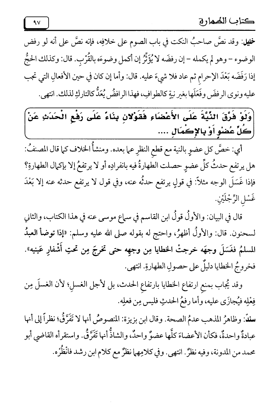 خليل: وقد نصَّ صاحبُ النكت في باب الصوم على خلافهِ، فإنه نصَّ على أنه لو رفض الوضوء– وهو لم يكمله– إن رفضه لا يُؤَثِّرُ إن أكمل وضوءَه بالقُرْبِ. قال: وكذلك الحجُّ إذا رَفَضَه بَعْدَ الإحرامِ ثم عاد فلا شيءَ عليه. قال: وأما إن كان في حين الأفعالِ التي تجب عليه ونوى الرفضَ وفَعَلَها بغير نيةٍ كالطوافِ، فهذا الرافضُ يُعَدُّ كالتاركِ لذلك. انتهى.