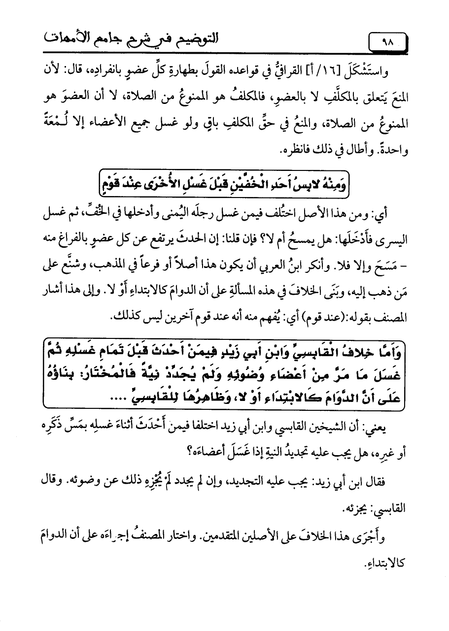 وَأَمَّا خِلافُ الْقَابِسيَّ وَابْنَ أَبِي زَيْدٍ فِيمَنْ أَحْدَثَ قَبْلَ تَمَامِ غَسْلِهِ ثُمَّ غَسَلَ مَا مَرَّ مِنْ أَعْضَاءِ وُضُوئِهِ وَلَم يُجَدِّدْ نِيَّةً فَالْمُخْتَارُ: بِنَاؤُهُ عَلَى أَنَّ الدَّوَامَ كَالابْتِدَاء أَوْ لا، وَظَاهِرُهَا لِلْقَابِسِيِّ ...
