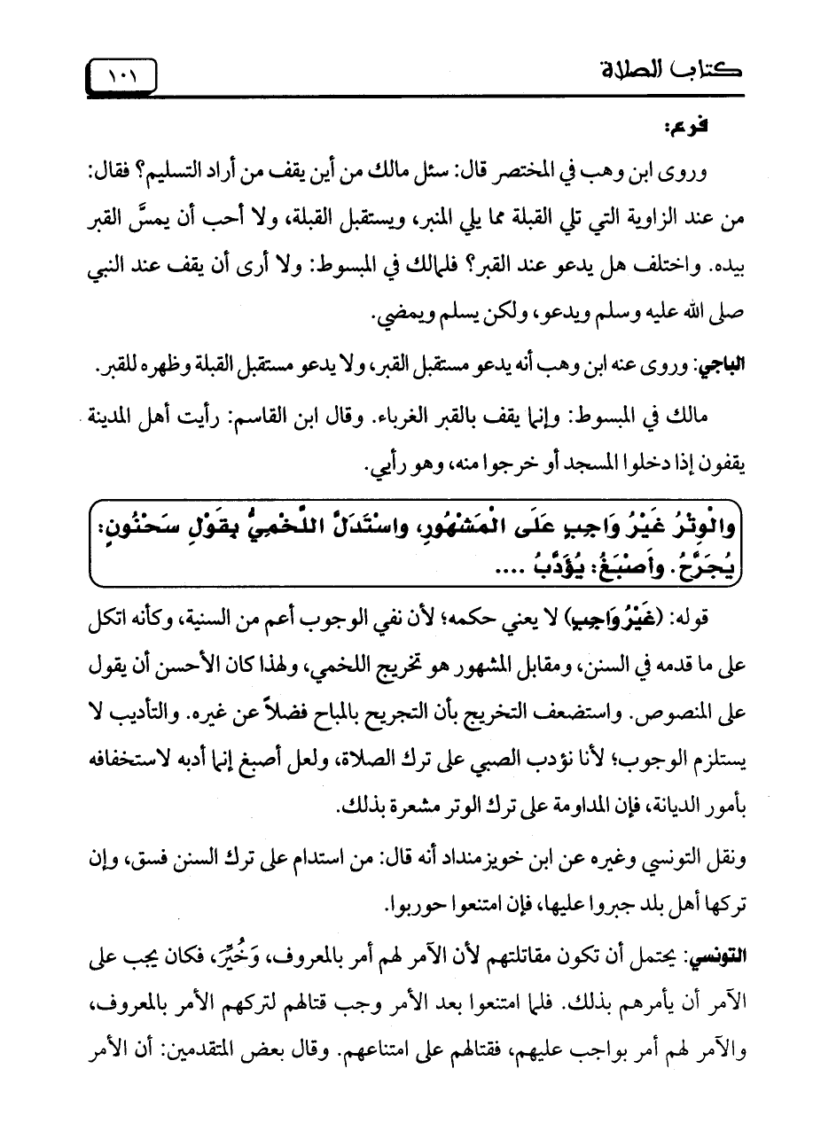والْوِتْرُ غَيْرُ وَاجِبٍ عَلَى الْمَشْهُورِ، واسْتَدَلَّ اللَّخْمِيُّ بِقَوْلِ سَحْنُونٍ: يُجَرَّحُ. وأَصْبَغُ: يُؤَدَّبُ ....
