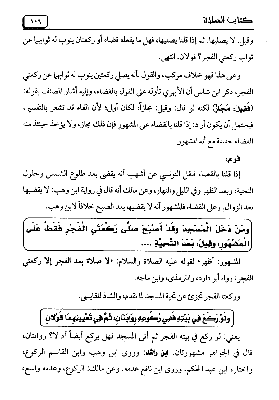 وعلى هذا فهو خلاف مركب، والقول بأنه يصلي ركعتين ينوب له ثوابهما عن ركعتي الفجر، ذكر ابن شاس أن الأبهري تأوله على القول بالقضاء، وإليه أشار المصنف بقوله: (فَقِيلَ: مَجَازٌ) لكنه لو قال: وقيل: مجازاً، لكان أولى؛ لأن الفاء قد تشعر بالتفسير، فيحتمل أن يكون أراد: إذا قلنا بالقضاء على المشهور فإن ذلك مجاز، ولا يؤخذ حينئذ منه القضاء حقيقة مع أنه المشهور.