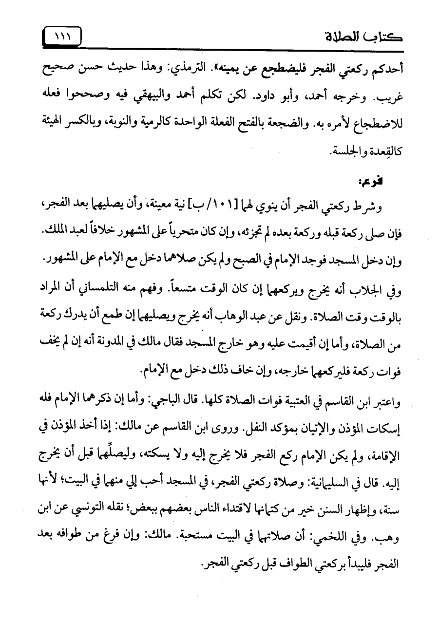 أحدكم ركعتي الفجر فليضطجع عن يمينه". الترمذي: وهذا حديث حسن صحيح غريب. وخرجه أحمد، وأبو داود. لكن تكلم أحمد والبيهقي فيه وصححوا فعله للاضطجاع لأمره به. والضجعة بالفتح الفعلة الواحدة كالرمية والنوبة، وبالكسر الهيئة كالقعدة والجلسة.