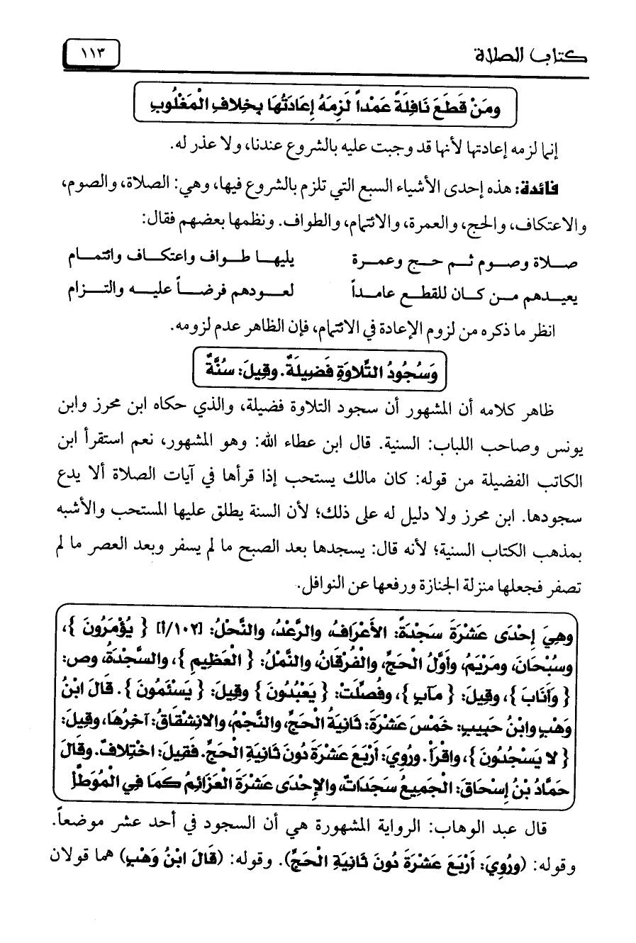 وهِيَ إِحْدَى عَشْرَةَ سَجْدَةً: الأَعْرَافُ، والرَّعْدُ، والنَّحْلُ: [102/أ] {يُؤْمَرُونَ}، وسُبْحَانَ، ومَرْيَمُ، وأَوَّلُ الْحَجِّ، والْفُرْقَانُ، والنَّمْلُ: {الْعَظِيمِ}، والسَّجْدَةُ، وص: {وَأَنَابَ}، وقِيلَ: {مَآبٍ}، وفُصِّلَتْ: {يَعْبُدُونَ} وقِيلَ: {يَسْئَمُونَ}. قَالَ ابْنُ وَهْبِ وابْنُ حَبيبِ: خَمْسَ عَشْرَةَ: ثَانِيَةُ الْحَجِّ، والنَّجْمُ، والانشِقَاقُ: آخِرُهَا، وقِيلَ: {لا يَسْجُدُونَِ}، واقْرَا. ورُويَ: أَرْبَعَ عَشْرَةَ دُونَ ثَانِيَةِ الْحَجِّ. فَقِيلَ: اخْتِلافٌ. وقالَ حَمَّادُ بْنُ إِسْحَاقَ: الْجَمِيعُ سَجَدَاتٌ، والإِحْدَى عَشْرَةَ الْعَزَائِمُ كَمَا فِي الْمُوَطَّأِ.
