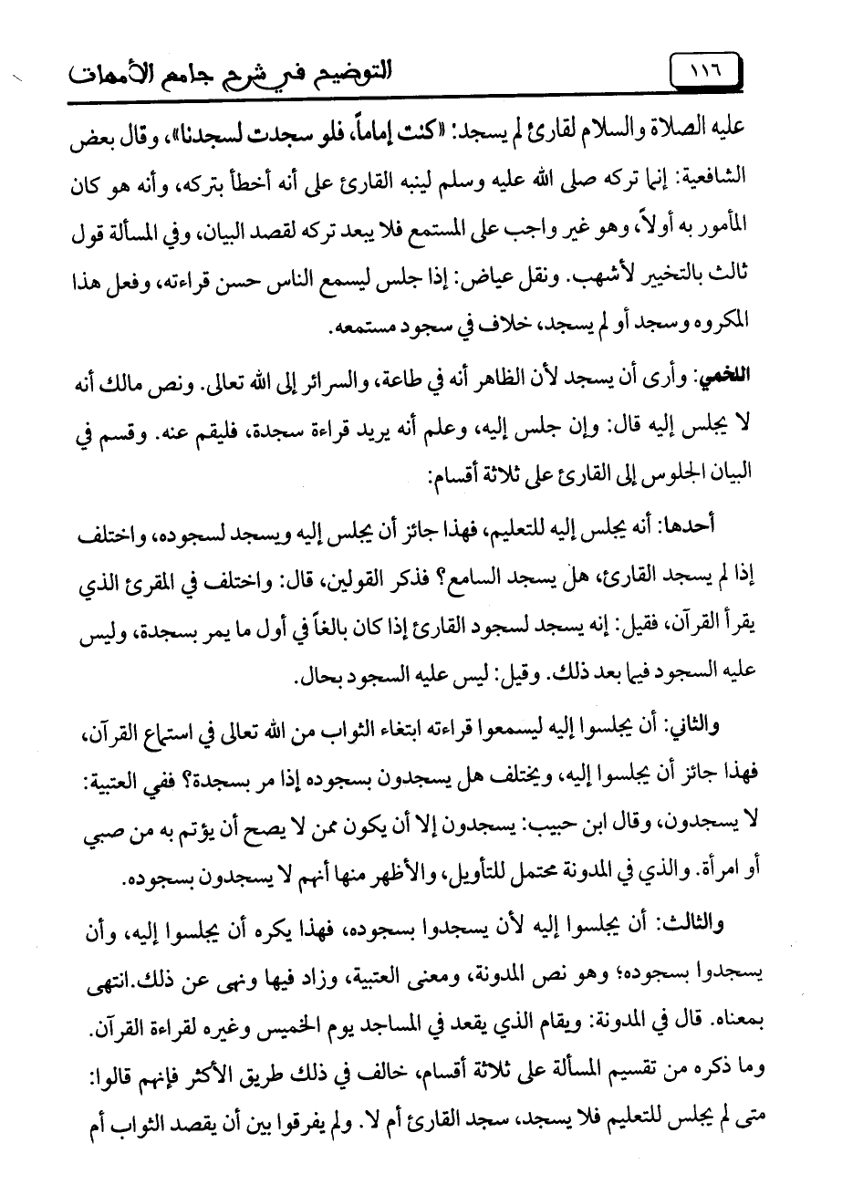 والثالث: أن يجلسوا إليه لأن يسجدوا بسجوده، فهذا يكره أن يجلسوا إليه، وأن يسجدوا بسجوده؛ وهو نص المدونة، ومعنى العتبية، وزاد فيها ونهى عن ذلك. انتهى بمعناه. قال في المدونة: ويقام الذي يقعد في المساجد يوم الخميس وغيره لقراءة القرآن. وما ذكره من تقسيم المسألة على ثلاثة أقسام، خالف في ذلك طريق الأكثر فإنهم قالوا: متى لم يجلس للتعليم فلا يسجد، سجد القارئ أم لا. ولم يفرقوا بين أن يقصد الثواب أم