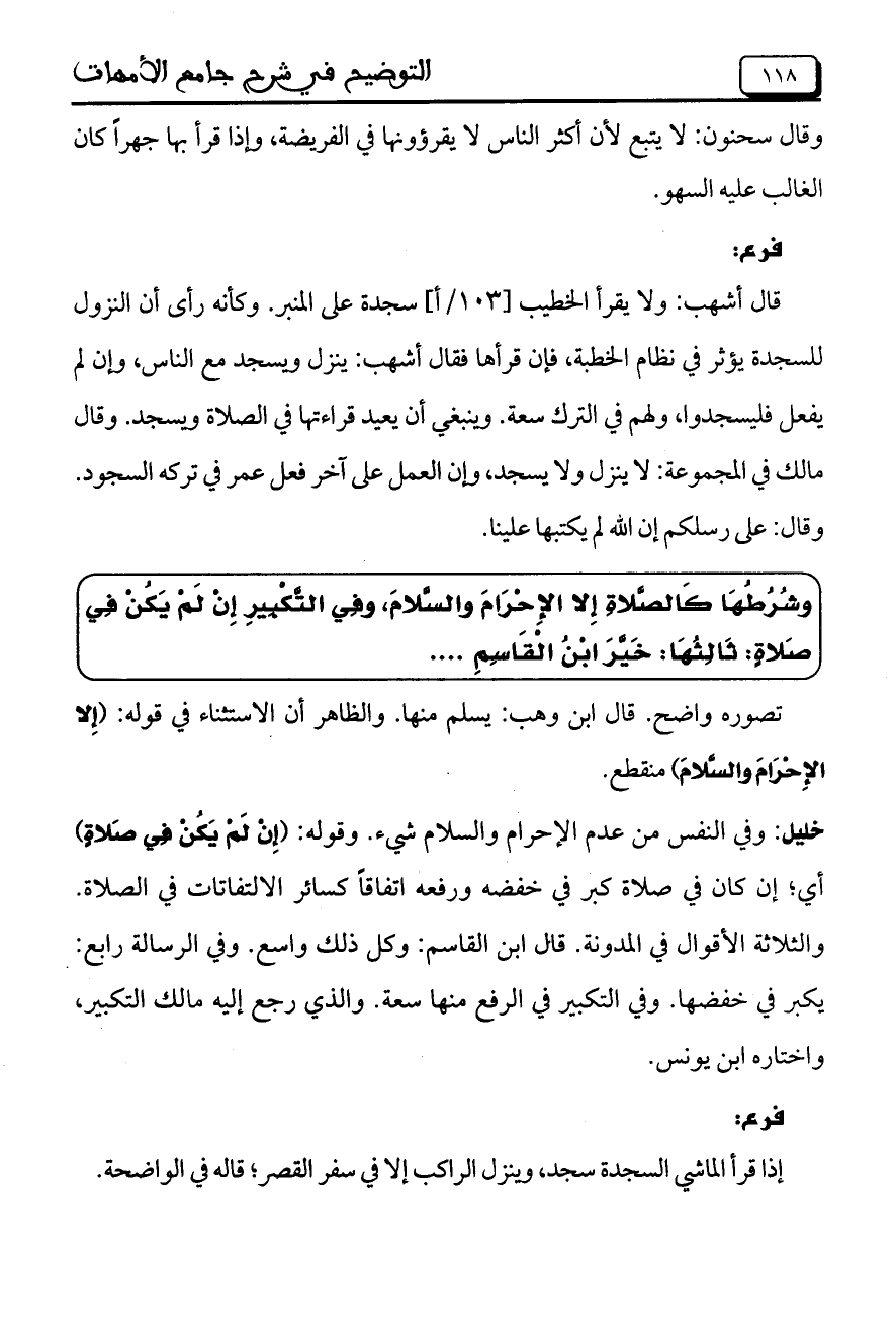 وشُرُطُهَا كَالصَّلاةِ إِلا الإِحْرَامَ والسَّلامَ، وفِي التَّكْبِيرِ إِنْ لَمْ يَكُنْ فِي صَلاةٍ: ثَالِثُهَا: خَيَّرَ ابْنُ الْقَاسِمِ ....