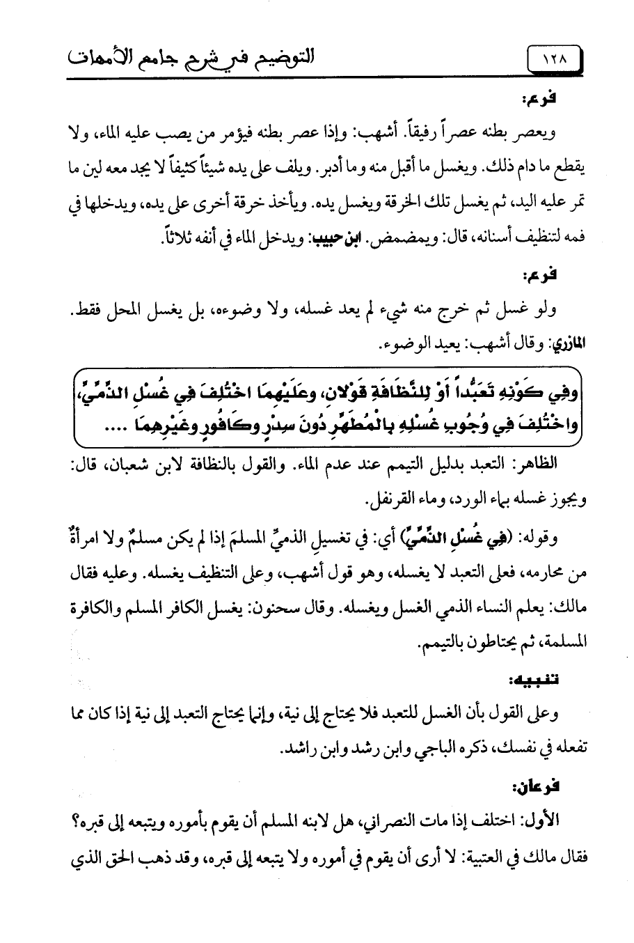 وقوله: (غُسْلِ الذِّمِّيِّ) أي: في تغسيل الذمي المسلم إذا لم يكن مسلم ولا امرأة من محارمه، فعلى التعبد لا يغسله، وهو قول أشهب، وعلى التنظيف يغسله. وعليه فقال مالك: يعلم النساء الذمي الغسل ويغسله. وقال سحنون: يغسل الكافر المسلم والكافرة المسلمة، ثم يحتاطون بالتيمم.