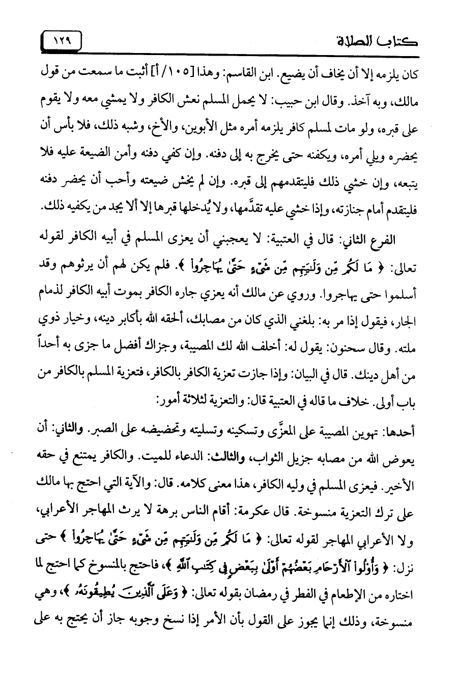 الفرع الثاني: قال في العتيبية: لا يعجبني أن يعزي المسلم في أبيه الكافر لقوله تعالى: {مَا لَكُم مِّن ولايَتِهِم مِّن شَيْءٍ حَتَّى يُهَاجِرُوا}. فلم يكن لهم أن يرثوهم وقد أسلموا حتى يهاجروا. وروى عن مالك أنه يعزي جاره الكافر بموت أبيه الكافر لذمام الجار، فيقول إذا مر به: بلغني الذي كان من مصابك، ألحقه الله بأكابر دينه، وخيار ذوي ملته. وقال سحنون: يقول له: أخلف الله لك المصيبة، وجزاك أفضل ما جزى به أحداً من أهل دينك. قال في البيان: وإذا جازت تعزية الكافر بالكافر، فتعزية المسلم بالكافر من باب أولى. خلاف ما قاله في التعبية قال: والتعزية لثلاثة أمور: