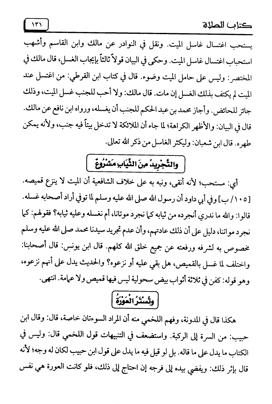 قالوا: والله ما ندري أنجرده من ثيابه كما نجرد موتانا، أم نغسله وعليه ثيابه؟ فقولهم: كما نجرد موتانا، دليل على أن ذلك عادتهم، وأن عدم تجريد سيدنا محمد صلى الله عليه وسلم مخصوص به لشرفه ورفعته عن جميع خلق الله كلهم. قال ابن يونس: قال أصحابنا: واختلف لما غسل بالقميص، هل بقى عليه أو نزعوه؟ والحديث يدل على أنهم نزعوه، وهو قوله: كفن في ثلاثة أثواب بيض سحولية ليس فيها قميص ولا عمامة. انتهى.
