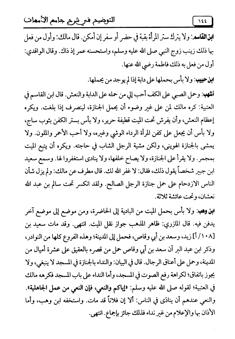 أشهب: وحمل الصبي على الكف أحب إلي من حمله على الدابة والنعش. قال ابن القاسم في العتبية: كره مالك لمن على غير وضوء أن يحمل الجنازة، لينصرف إذا بلغت. ويكره إعظام النعش، وأن يفرش تحت الميت قطيفة حرير، ولا بأس بستر الكفن بثوب ساج، ولا بأس أن يجعل على كفن المرأة الرداء الوشي وغيره، ولا أحب الأحمر والملون. ولا يمشي بالجنازة الهويني، ولكن مشية الرجل الشاب في حاجته. ويكره أن يتبع الميت بمجمر. ولا يقرأ على الجنازة، ولا يصاح خلفها، ولا ينادى استغفروا لها. وسمع سعيد ابن جبير شخصاً يقول ذلك، فقال: لا غفر الله لك. قال مطرف عن مالك: ولم يزل شأن الناس الازدحام على حمل جنازة الرجل الصالح. ولقد انكسر تحت سالم بن عبد الله نعشان، وتحت عائشة ثلاثة.