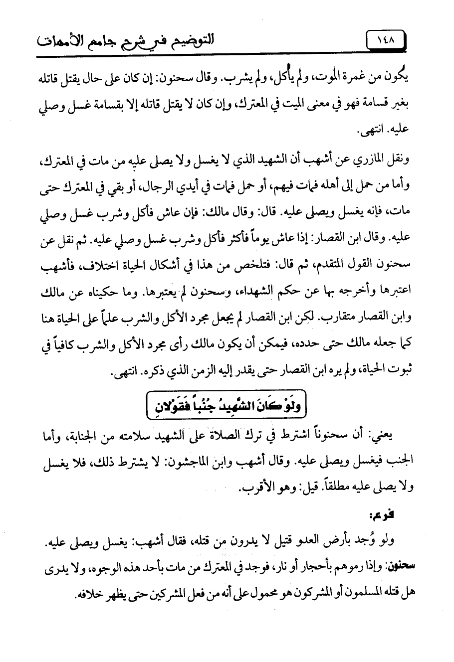 يعني: أن سحنوناً اشترط في ترك الصلاة على الشهيد سلامته من الجنابة، وأما الجنب فيغسل ويصلى عليه. وقال أشهب وابن الماجشون: لا يشترط ذلك، فلا يغسل ولا يصلى عليه مطلقاً. قيل: وهو الأقرب.