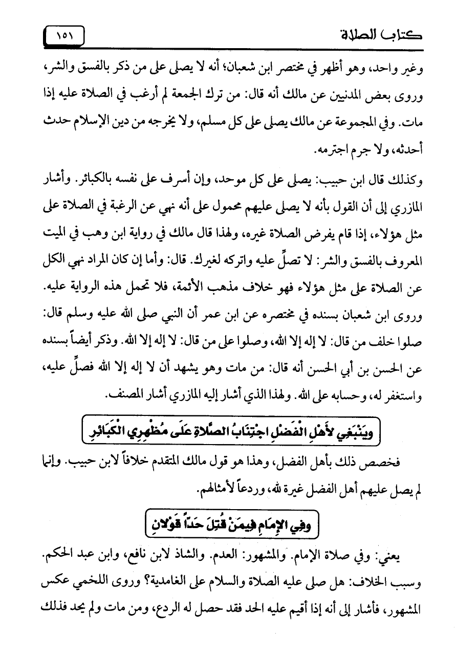 وغير واحد، وهو أظهر في مختصر ابن شعبان؛ أنه لا يصلى على من ذكر بالفسق والشر، وروى بعض المدنيين عن مالك أنه قال: من ترك الجمعة لم أرغب في الصلاة عليه إذا مات. وفي المجموعة عن مالك يصلى على كل مسلم، ولا يخرجه من دين الإسلام حدث أحدثه، ولا جرم اجترمه.