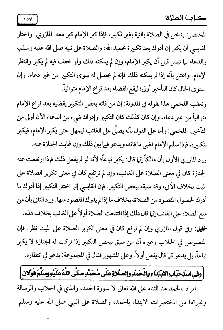 المراد بالحمد هنا الثناء على الله تعالى لا سورة الحمد، والذي في الجلاب والرسالة وغيرهما من المختصرات الابتداء بالحمد، والصلاة على النبي صلى الله عليه وسلم.