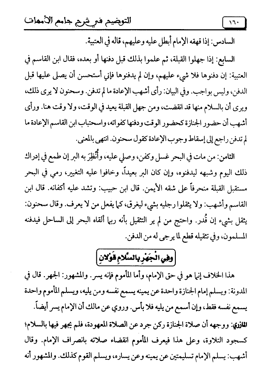 السابع: إذا جهلوا القبلة، ثم علموا بذلك قبل دفنها أو بعده، فقال ابن القاسم في العتبية: إن دفنوها فلا شيء عليهم، وإن لم يدفنوها فإني أستحسن أن يصلى عليها قبل الدفن، وليس بواجب. وفي البيان: رأى أشهب الإعادة ما لم تدفن. وسحنون لا يرى ذلك، ويرى أن بالسلام منها قد انقضت، ومن جهل القبلة يعيد في الوقت، ولا وقت هنا. ورأى أشهب أن حضور الجنازة كحضور الوقت ودفنه كفواته، واستحبّاب ابن القاسم الإعادة ما لم تدفن راجع إلى إسقاط وجوب الإعادة كقول سحنون. انتهى بالمعنى.