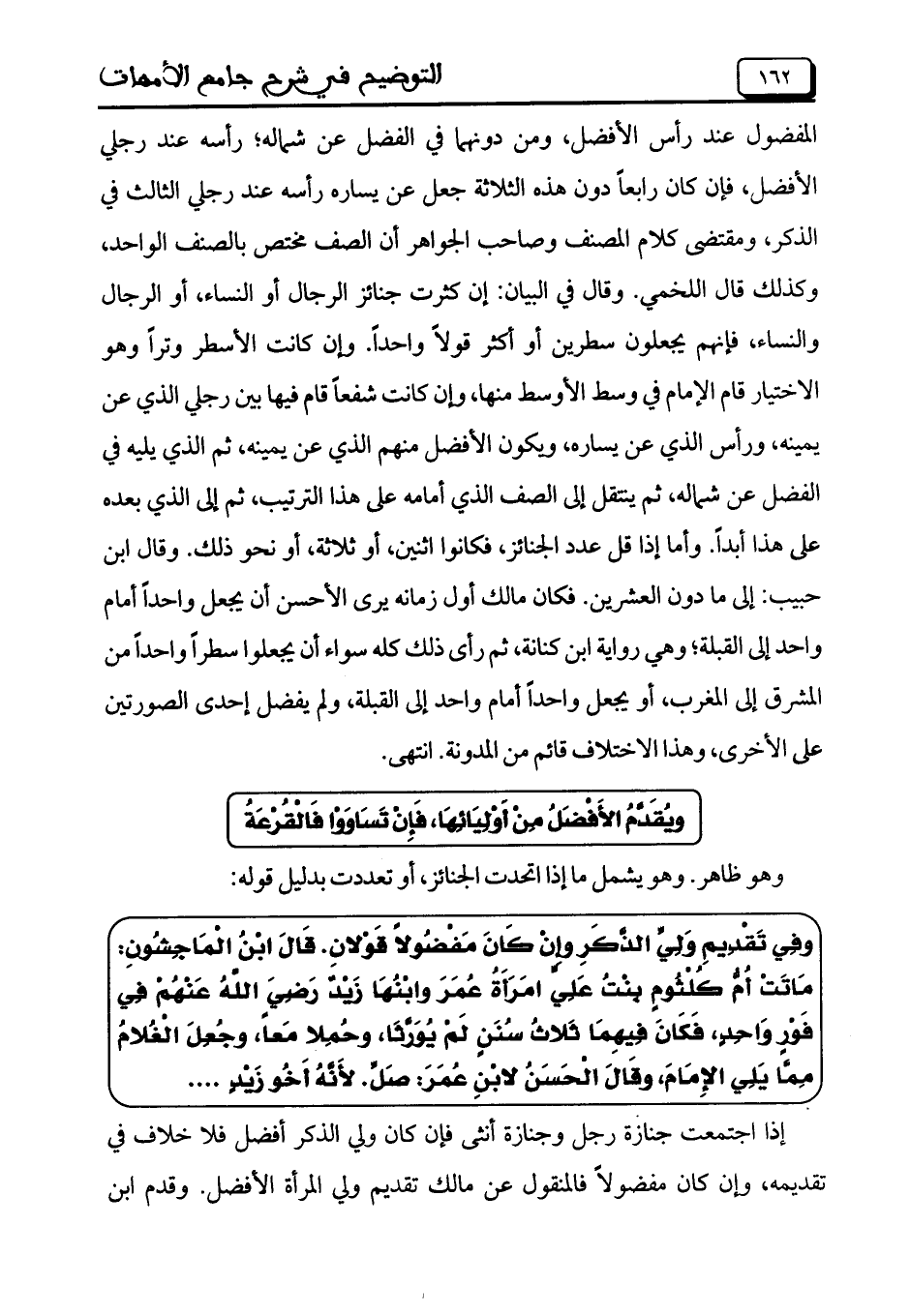 وفِي تَقْدِيمِ وَلِيِّ الذَّكَرِ وإِنْ كَانَ مَفْضُولاً قَوْلانِ. قَالَ ابْنُ الْمَاجِشُونِ: مَاتَتْ أُمُّ كُلْثُومٍ بِنْتُ عَلِي امَرَأَةُ عُمَرَ وابْنُهَا زَيْدٌ رَضِيَ اللهُ عَنْهُمْ فِي فَوْرِ وَاحِدٍ، فَكَانَ فِيهِمَا ثلاثُ سُنَنٍ لَمْ يُوّرَّثَا، وحُمِلا مَعاً، وجُعِلَ الْغُلامُ مِمَّا يَلِي الإِمَامَ، وقَالَ الْحَسَنُ لابْنِ عُمَرَ: صَلِّ. لأَنَّهُ أَخُو زَيْدٍ ......