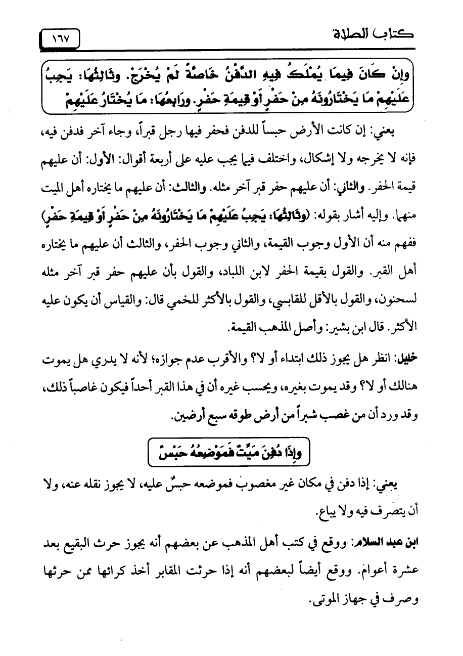 يعني: إن كانت الأرض حبساً للدفن فحفر فيها رجل قبراً، وجاء آخر فدفن فيه، فإنه لا يخرجه ولا إشكال، واختلف فيما يجب عليه على أربعة أقوال: الأول: أن عليهم قيمة الحفر. والثاني: أن عليهم حفر قبر آخر مثله. والثالث: أن عليهم ما يختاره أهل الميت منهما. وإليه أشار بقوله: (وثَالِثُهَا: يَجِبُ عَلَيْهِمْ مَا يَخْتَارُونَهُ مِنْ حَفْرِ أَوْ قِيمَةِ حَفْرٍ) ففهم منه أن الأول وجوب القيمة، والثاني وجوب الحفر، والثالث أن عليهم ما يختاره أهل القبر. والقول بقيمة الحفر لابن اللباد، والقول بأنعليهم حفر قبر آخر مثله لسحنون، والقول بالأقل للقابسي، والقول بالأكثر للخمي قال: والقياس أن يكون عليه الأكثر. قال ابن بشير: وأصل المذهب القيمة.