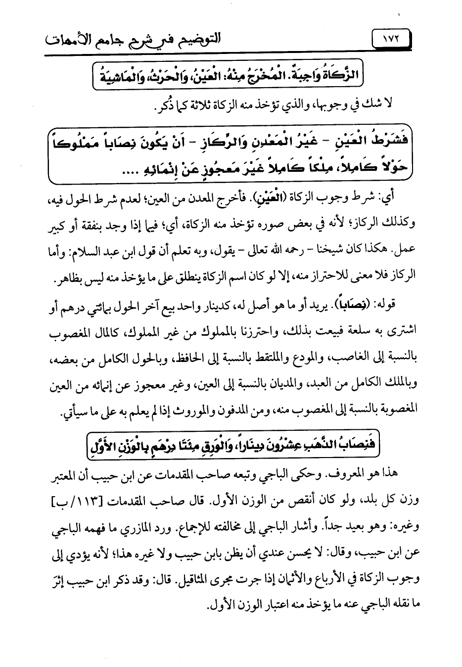 فَشَرْطُ الْعَيْنِ -غَيْرُ الْمَعْدِنِ وَالرِّكَازِ- أَنْ يَكُونَ نِصَاباً مَمْلُوكاً حَوْلاً كَامِلاً، مِلْكاً كَامِلاً غَيْرَ مَعجُوزٍ عَنْ إِنْمَائِهِ ...