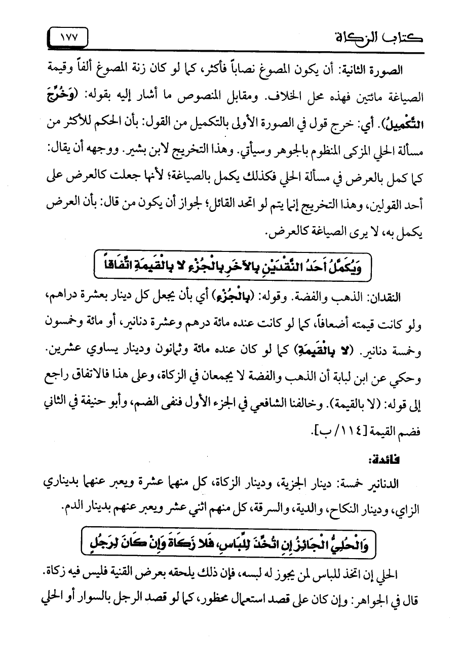 الصورة الثانية: أن يكون المصوغ نصاباً فأكثر، كما لو كان زنة المصوغ ألفاً وقيمة الصياغة مائتين فهذه محل الخلاف. ومقابل المنصوص ما أشار إليه بقوله: (وَخُرِّجَ التَّكْمِيلُ). أي: خرج قول في الصورة الأولى بالتكميل من القول: بأن الحكم للأكثر من مسألة الحلي المزكى المنظوم بالجوهر وسيأتي. وهذا التخريج لابن بشير. ووجهه أن يقال: كما كمل بالعرض في مسألة الحلي فكذلك يكمل بالصياغة؛ لأنها جعلت كالعرض على أحد القولين، وهذا التخريج إنما يتم لو اتحد القائل؛ لجواز أن يكون من قال: بأن العرض يكمل به، لا يرى الصياغة كالعرض.