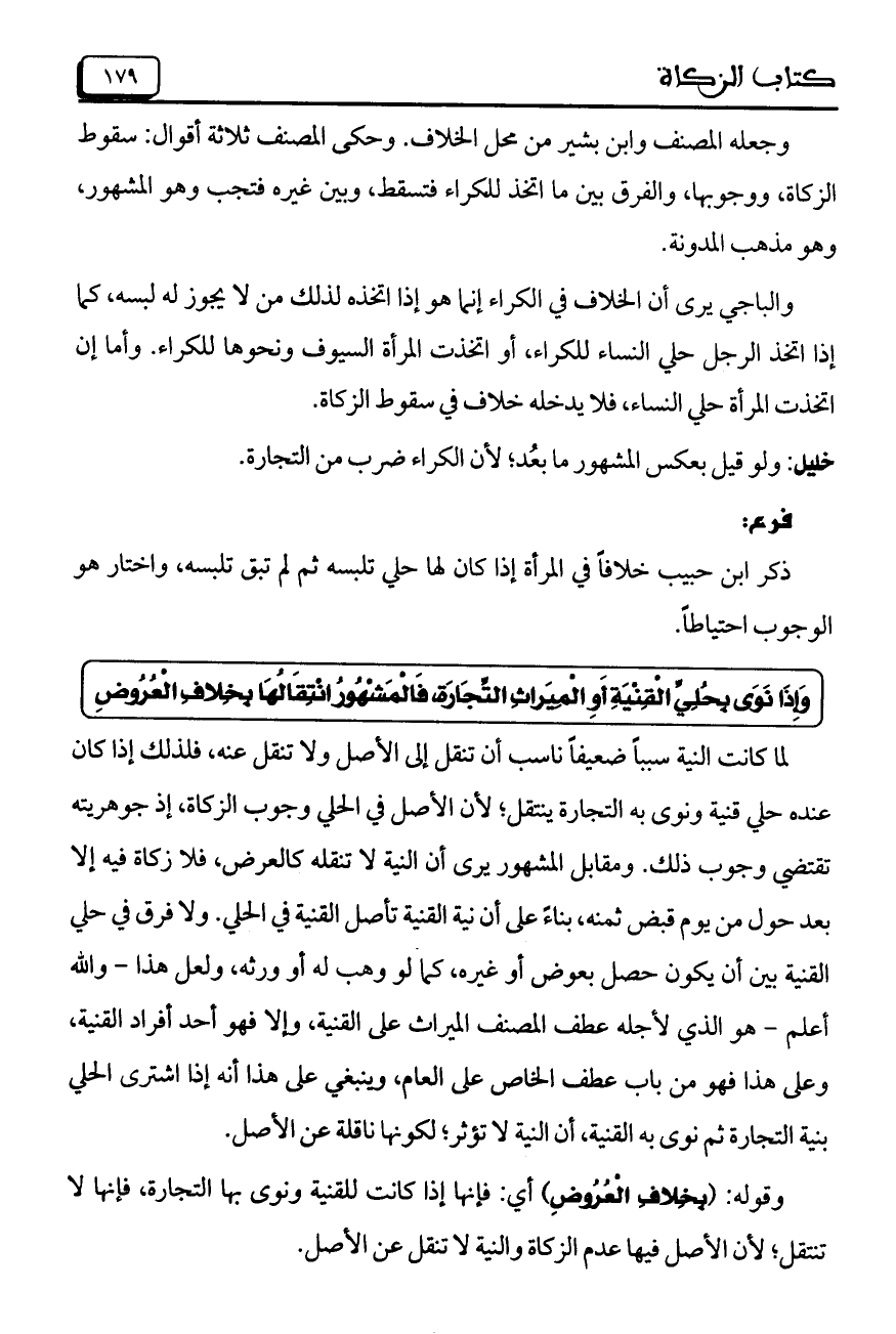 لما كانت النية سبباً ضعيفاً ناسب أن تنقل إلى الأصل ولا تنقل عنه، فلذلك إذا كان عنده حلي قنية ونوى به التجارة ينتقل؛ لأن الأصل في الحلي وجوب الزكاة، إذ جوهريته تقتضي وجوب ذلك. ومقابل المشهور يرى أن النية لا تنقله كالعرض، فلا زكاة فيه إلا بعد حول من يوم قبض ثمنه، بناءً على أن نية القنية تأصل القنية في الحلي. ولا فرق في حلي القنية بين أن يكون حصل بعوض أو غيره، كما لو وهب له أو ورثه، ولعل هذا- والله أعلم- هو الذي لأجله عطف المصنف الميراث على القنية، وإلا فهو أحد أفراد القنية، وعلى هذا فهو من باب عطف الخاص على العام، وينبغي على هذا أنه إذا اشترى الحلي بنية التجارة ثم نوى به القنية، أن النية لا تؤثر؛ لكونها ناقلة عن الأصل.