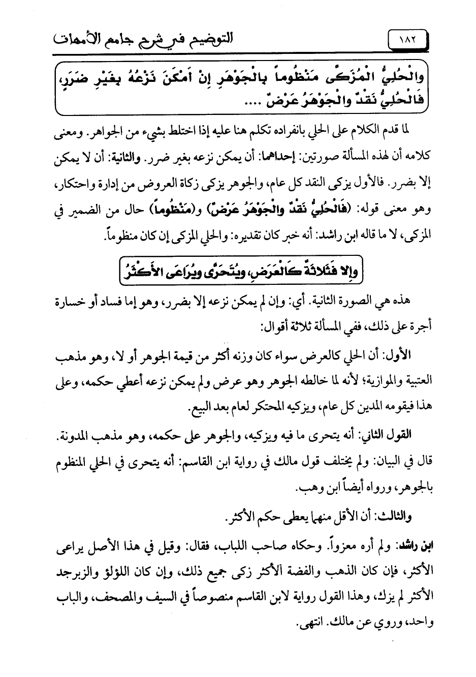 والْحُلِيُّ الْمُزَكَّى مَنْظُوماً بِالْجَوْهَرِ إِنْ أَمْكَنَ نَزْعُهُ بِغَيْرِ ضَرَرٍ، فَالْحُلِيُّ نَقْدٌ والْجَوْهَرُ عَرْضٌ ....