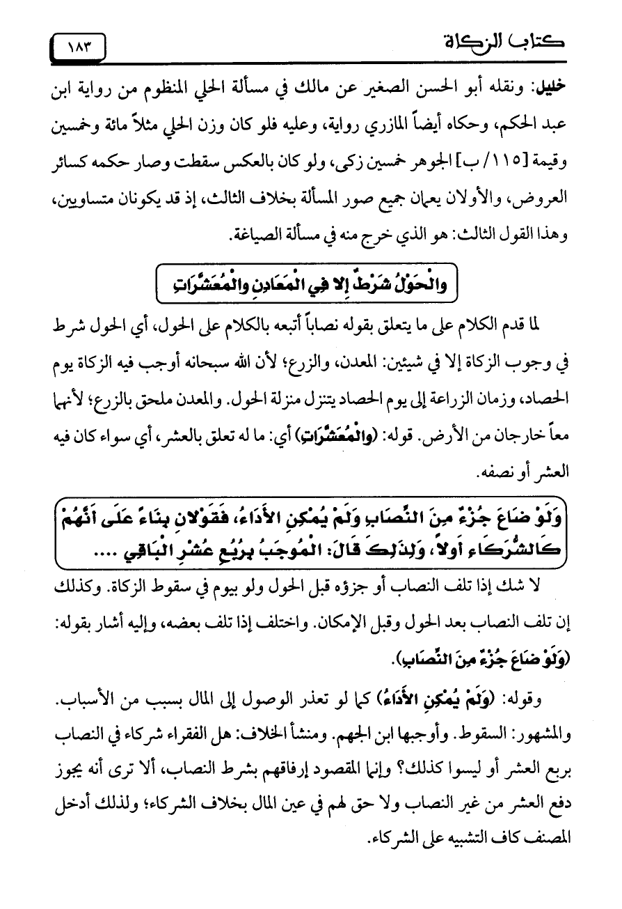 خليل: ونقله أبو الحسن الصغير عن مالك في مسألة الحلي المنظوم من رواية ابن عبد الحكم، وحكاه أيضاً المازري رواية، وعليه فلو كان وزن الحلي مثلاً مائة وخمسين وقيمة [115/ب] الجوهر خمسين زكى، ولو كان بالعكس سقطت وصار حكمه كسائر العروض، والأولان يعمان جميع صور المسألة بخلاف الثالث، إذ قد يكونان متساويين، وهذا القول الثالث: هو الذي خرج منه في مسألة الصياغة.