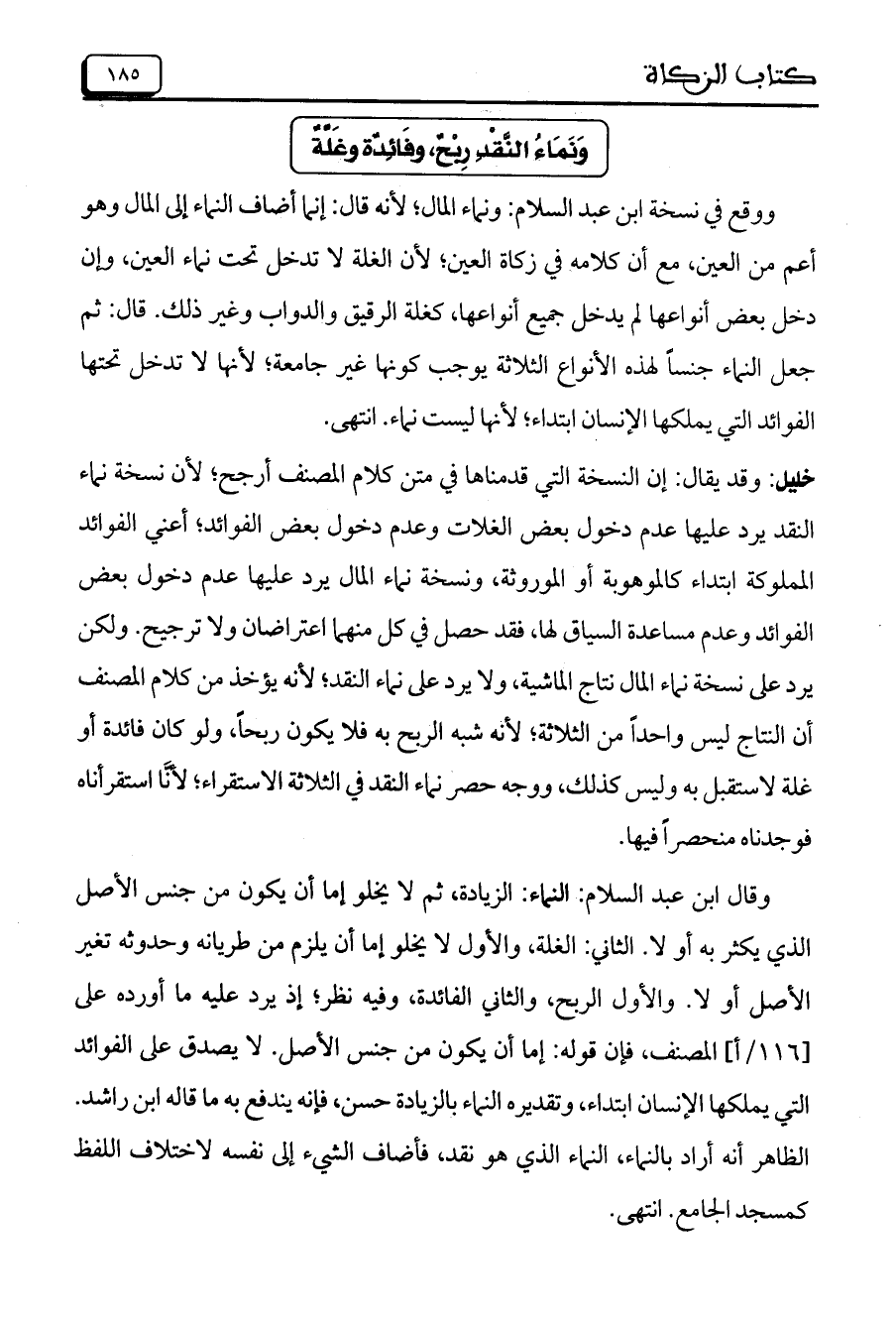 خليل: وقد يقال: إن النسخة التي قدمناها في متن كلام المصنف أرجح؛ لأن نسخة نماء النقد يرد عليها عدم دخول بعض الغلات وعدم دخول بعض الفوائد؛ أعني الفوائد المملوكة ابتداء كالموهوبة أو الموروثة، ونسخة نماء المال يرد عليها عدم دخول بعض الفوائد وعدم مساعدة السياق لها، فقد حصل في كل منهما اعتراضان ولا ترجيح. ولكن يرد على نسخة نماء المال نتاج الماشية، ولا يرد على نماء النقد؛ لأنه يؤخذ من كلام المصنف أن النتاج ليس واحداً من الثلاثة؛ لأنه شبه الربح به فلا يكون ربحاً، ولو كان فائدة أو غلة لاستقبل به وليس كذلك، ووجه حصر نماء النقد في الثلاثة الاستقراء؛ لأنَّا استقرأناه فوجدناه منحصراً فيها.