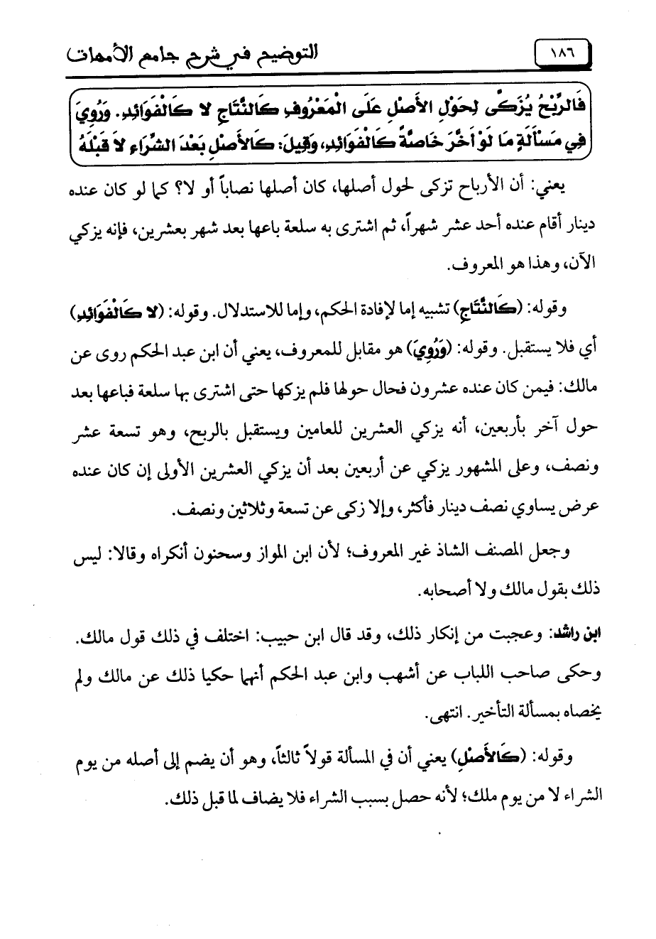 فَالرِّبْحُ يُزَكَّى لِحَوْلِ الأَصْلِ عَلَى الْمَعْرُوفِ كَالنَّتَاجِ لا كَالْفَوَائِدِ. وَرُويَ فِي مَسْأَلَةٍ مَا لَوْ أَخَّرَ خَاصَّةً كَالْفَوَائِدِ، وَقِيلَ: كَالأَصْلِ بَعْدَ الشِّرَاءِ لاَ قَبْلَهُ.