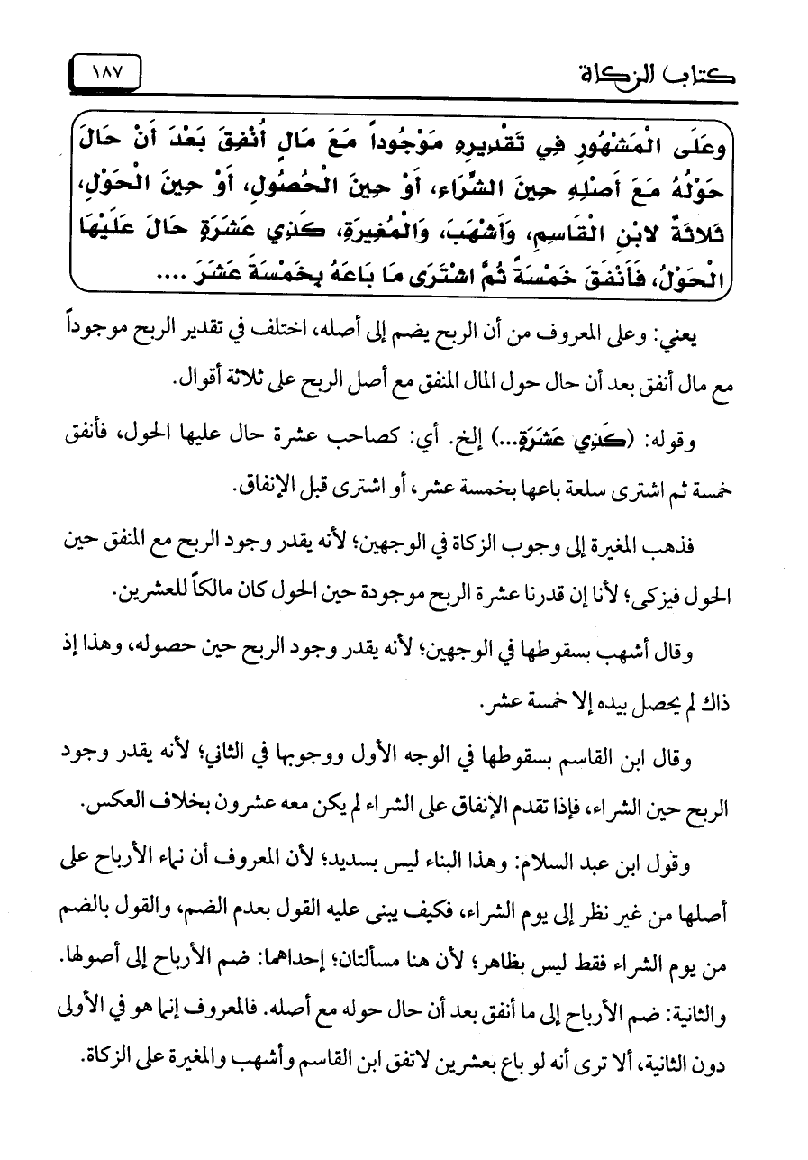 وقول ابن عبد السلام: وهذا البناء ليس بسديد؛ لأن المعروف أن نماء الأرباح على أصلها من غير نظر إلى يوم الشراء، فكيف يبنى عليه القول بعدم الضم، والقول بالضم من يوم الشراء فقط ليس بظاهر؛ لأن هنا مسألتان؛ إحداهما: ضم الأرباح إلى أصولها. والثانية: ضم الأرباح إلى ما أنفق بعد أن حال حوله مع أصله. فالمعروف إنما هو في الأولى دون الثانية، ألا ترى أنه لو باع بعشرين لاتفق ابن القاسم وأشهب والمغيرة على الزكاة.