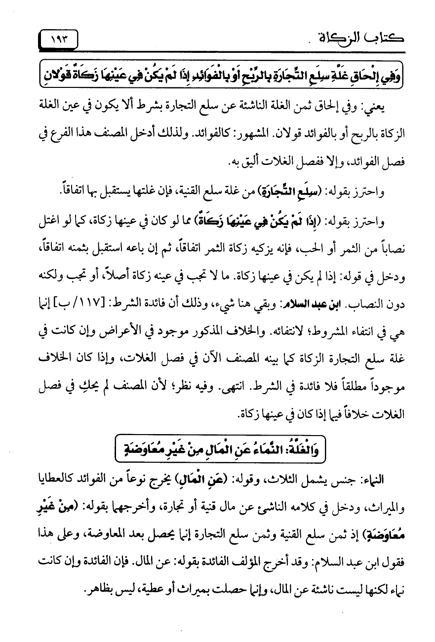 النماء: جنس يشمل الثلاث، وقوله: (عَنِ الْمَالِ) يخرج نوعاً من الفوائد كالعطايا والميراث، ودخل في كلامه الناشئ عن مال قنية أو تجارة، وأخرجهما بقوله: (مِنْ غَيْرِ مُعَاوَضَةٍ) إذ ثمن سلع القنية وثمن سلع التجارة إنما يحصل بعد المعاوضة، وعلى هذا فقول ابن عبد السلام: وقد أخرج المؤلف الفائدة بقوله: عن المال. فإن الفائدة وإن كانت نماء لكنها ليست ناشئة عن المال، وإنما حصلت بميراث أو عطية، ليس بظاهر.