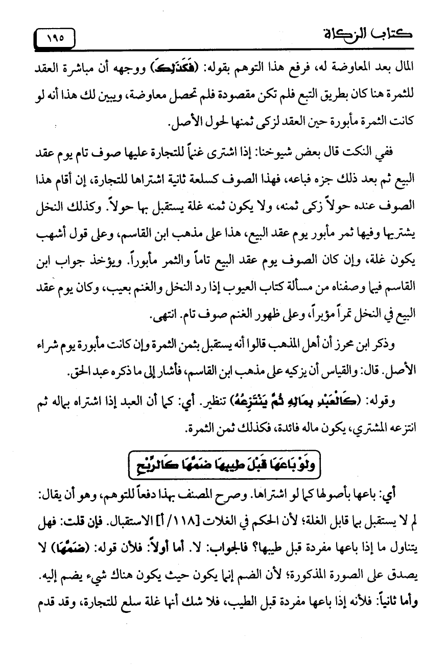 وذكر ابن محرز أن أهل المذهب قالوا أنه يستقبل بثمن الثمرة وإن كانت مأبورة يوم شراء الأصل. قال: والقياس أن يزكيه على مذهب ابن القاسم، فأشار إلى ما ذكره عبد الحق.