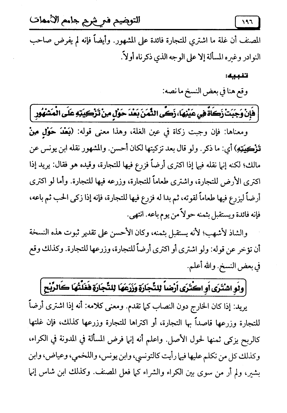 والشاذ لأشهب؛ لأنه يستقبل بثمنه، وكان الأحسن على تقدير ثبوت هذه النسخة أن تؤخر عن قوله: ولو اشترى أو اكترى أرضاً للتجارة، وزرعها للتجارة. وكذلك وقع في بعض النسخ. والله أعلمز