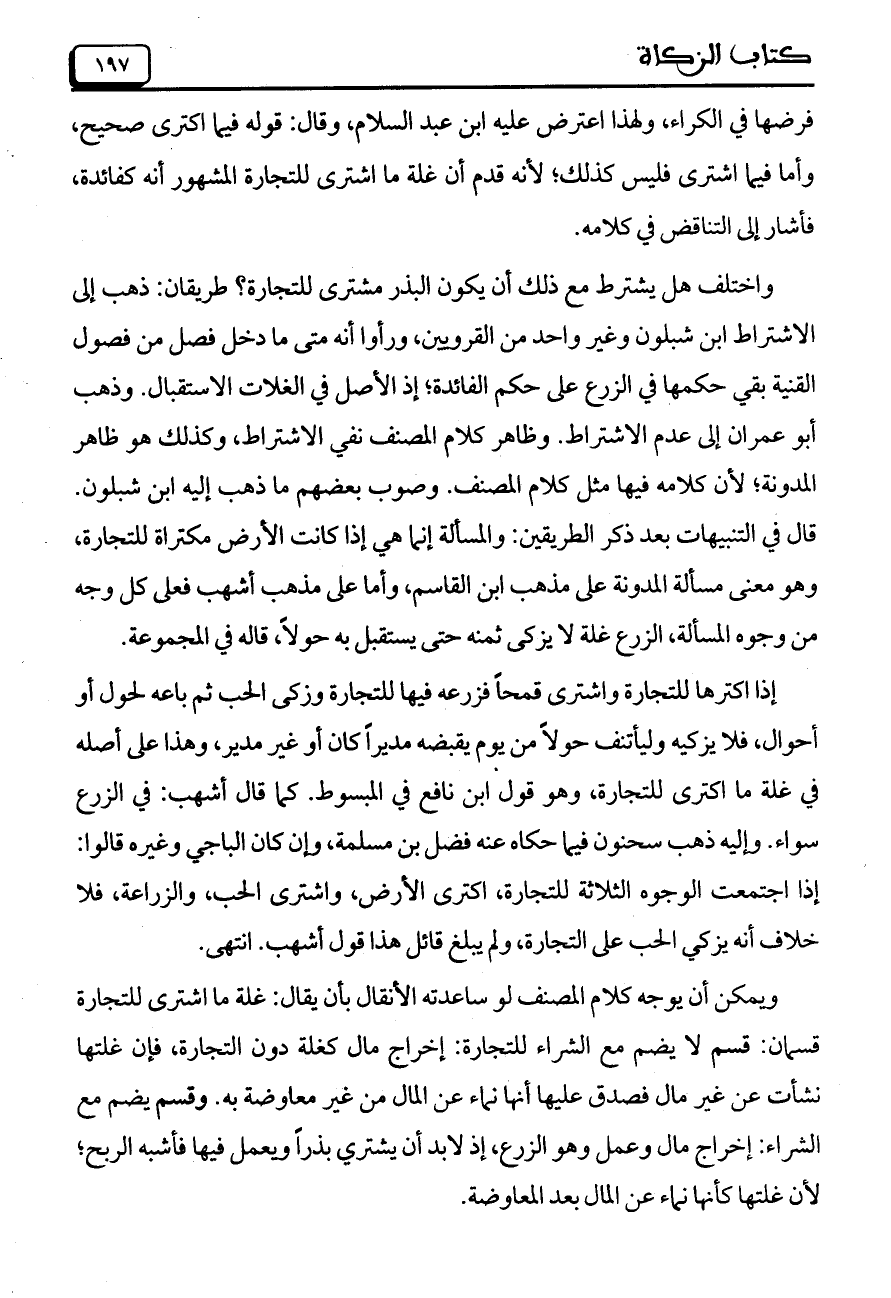 إذا اكترها للتجارة واشترى قمحاً فزرعه فيها للتجارة وزكى الحب ثم باعه لحول أو أحوال، فلا يزكيه وليأتنف حولاً من يوم يقبضه مديراً كان أو غير مدير، وهذا على أصله في غلة ما اكترى للتجارة، وهو قول ابن نافع في المبسوط. كما قال أشهب: في الزرع سواء. وإليه ذهب سحنون فيما حكاه عنه فضل بن مسلمة، وإن كان الباجي وغيره قالوا: إذا اجتمعت الوجوه الثلاثة للتجارة، اكترى الأرض، واشترى الحب، والزراعة، فلا خلاف أنه يزكي الحب على التجارة، ولم يبلغ قائل هذا قول أشهب. انتهى.