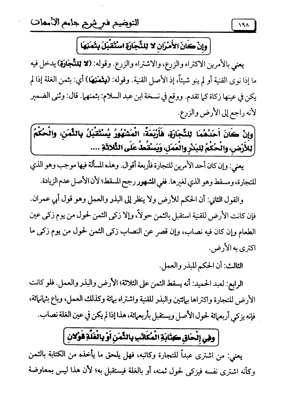 وإِنْ كَانَ أَحَدُهُمَا للِتِّجَارَةِ، فَأَرْبَعَةٌ: الْمَشْهُورُ يُسْتَقْبَلُ بِالثَّمَنِ، والْحُكْمُ لِلأَرْضِ، والْحُكْمُ لِلبَذْرِ والْعَمَلِ، وَيَسْقُطُ عَلَى الثَّلاثَةِ ....