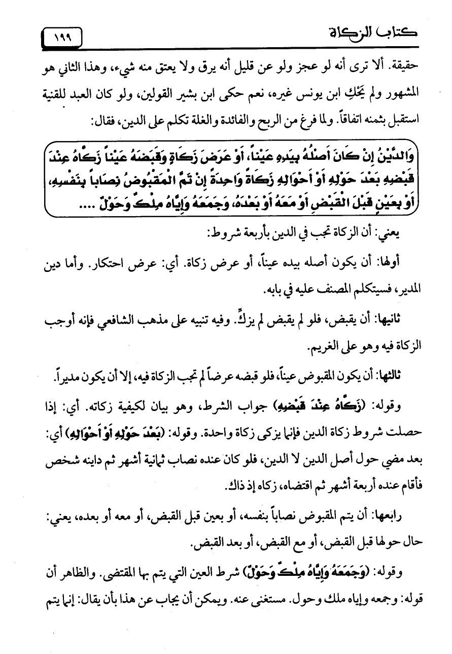 وقوله: (وَجَمَعَهُ وَإِيَّاهُ مِلْكٌ وَحَوْلٌ) شرط العين التي يتم بها المقتضى. والظاهر أن قوله: وجمعه وإياه ملك وحول. مستغنى عنه. ويمكن أن يجاب عن هذا بأن يقال: إنما يتم