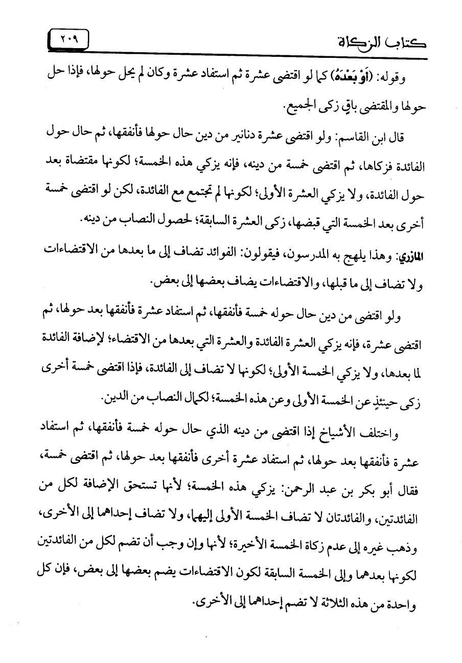 واختلف الأشياخ إذا اقتضى من دينه الذي حال حوله خمسة فأنفها، ثم استفاد عشرة فأنفقها بعد حولها، ثم استفاد عشرة أخرى فأنفقها بعد حولها، ثم اقتضى خمسة، فقال أبوبكر بن عبد الرحمن: يزكي هذه الخمسة؛ لأنها تستحق الإضافة لكل من الفائدتين، والفائدتان لا تضاف الخمسة الأولى إليهما، ولا تضاف إحداهما إلى الأخرى، وذهب غيره إلى عدم زكاة الخمسة الأخيرة؛ لأنها وإن وجب أن تضم لكل من الفائدتين لكونها بعدهما وإلى الخمسة السابقة لكون الاقتضاءات يضم بعضها إلى بعض، فإن كل واحدة من هذه الثلاثة لا تضم إحداهما إلى الأخرى.