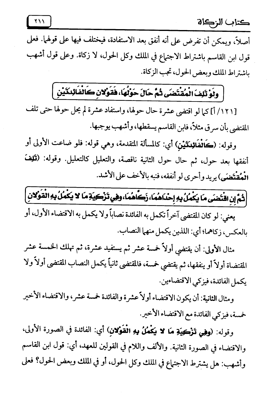 مثال الأولى: أن يقتضي أولاً خمسة عشر ثم يستفيد عشرة، ثم تهلك الخمسة عشر المقتضاة أولاً أو ينفقها، ثم يقتضي خمسة، فالمقتضى ثانياً يكمل النصاب المقتضى أولاً ولا يكمل الفائدة، فيزكي الاقتضاءين.