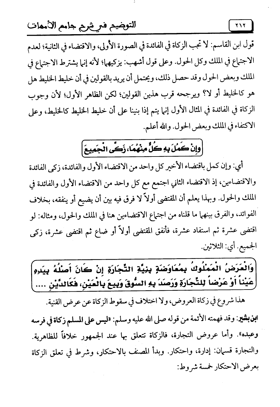 ابن بشير: وقد فهمته الأئمة من قوله صلى الله عليه وسلم: "ليس على المسلم زكاة في فرسه وعبده". وأما عروض التجارة، فالزكاة تتعلق بها عند الجمهور خلافاً للظاهرية. والتجارة قسمان: إدارة، واحتكار. وبدأ المصنف بالاحتكار، وشرط في تعلق الزكاة بعرض الاحتكار خمسة شروط: