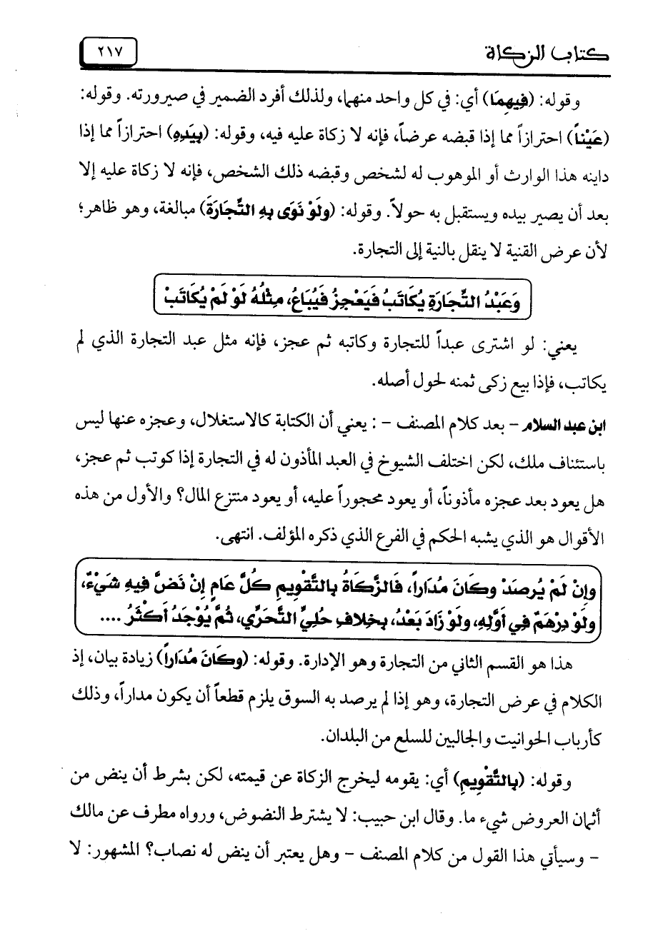ابن عبد السلام- بعد كلام المصنف-: يعني أن الكتابة كالاستغلال، وعجزه عنها ليس باستئناف ملك، لكن اختلف الشيوخ في العبد المأذون له في التجارة إذا كوتب ثم عجز، هل يعود بعد عجزه مأذوناً، أو يعود محجوراً عليه، أو يعود منتزع المال؟ والأول من هذه الأقوال هو الذي يشبه الحكم في الفرع الذي ذكره المؤلف. انتهى.