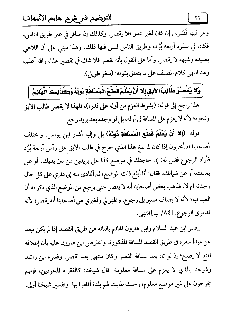 وفسر ابن عبد السلام وابن هارون الهائم بالتائه عن طريق القصد إذا لم يكن يبعد عن مبدأ سفره في طريق القصد المسافة المذكورة. واعترض ابن هارون عليه بأن إطلاقه المنع لا يصح؛ إذ لو تاه بعد مسافة القصر وكان منتهى بعد لقصر. وفسره ابن راشد وشيخنا بالذي لا يعزم على مسافة معلومة. قال شيخنا: كالفقراء المجردين، فإنهم يخرجون على غير موضع معلوم، وحيث طابت لهم بلدة أقاموا بها. وتفسير شيخنا أولى.