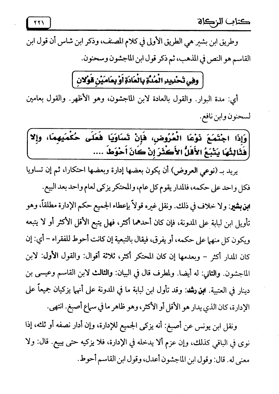ابن بشير: ولا خلاف في ذلك. ونقل غيره قولاً بإعطاء الجميع حكم الإدارة مطلقاً، وهو تأويل ابن لبابة على المدونة، فإن كان أحدهما أكثر، فهل يتبع الأقل الأكثر أو لا يتبعه ويكون كل منهما على حكمه، أو يفرق، فيقال بالتبعية إن كانت أحوط للفقراء- أي: إن كان المدار أكثر- وبعدمها إن كان المحتكر أكثر، ثلاثة أقوال: والقول الألو: لابن الماجشون. والثاني: له أيضاً. ولمطرف قال في البيان: والثالث لابن القاسم وعيسى بن دينار في العتيبة. ابن رشد: وقد تأول ابن لبابة ما في المدونة على أنهما يزكيان جميعاً على الإدارة، كان الذي يدار هو الأقل أو الأكثر، وهو ظاهر ما في سماع أصبغ. انتهى.