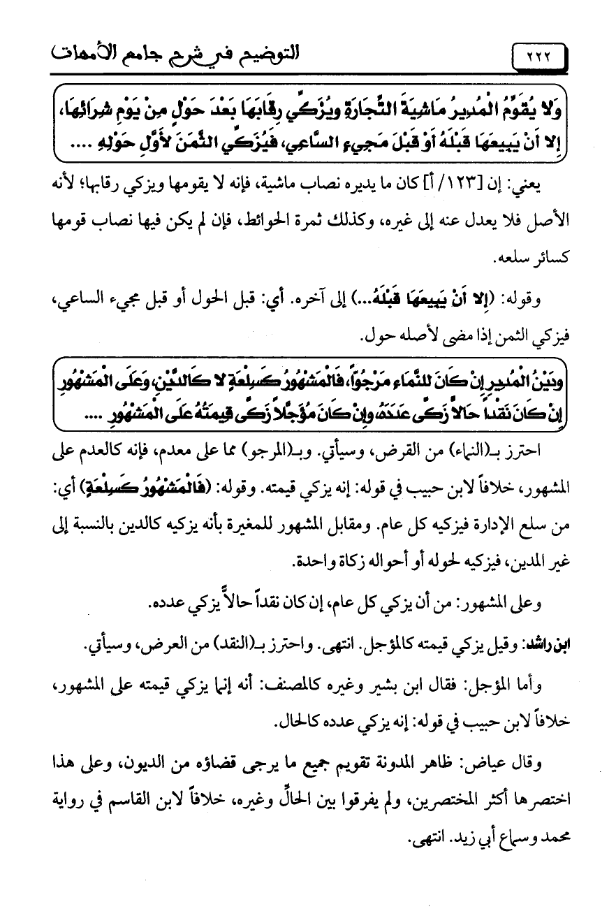 وَلا يُقَوِّمُ الْمُدِيرُ مَاشِيَةَ التِّجَارَة ِويُزَكِّي رِقَابَهَا بَعْدَ حَوْلٍ مِنْ يَوْمِ شِرَائِهَا، إِلا أَنْ يَبِيعَهَا قَبْلَهُ أَوْ قَبْلَ مَجِيءِ السَّاعِي، فَيُزَكّي الثَّمَنَ لأَوَّلِ حَوْلِهِ ...