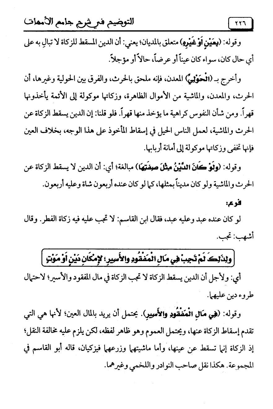 وقوله: (فِي مَالِ الْمَفْقُودِ والأَسِيرِ). يحتمل أن يريد بالمال العين؛ لأنها هي التي تقدم إسقاط الزكاة عنها، ويحتمل العموم وهو ظاهر لفظه، لكن يلزم عليه مخالفة النقل؛ إذ الزكاة إنما تسقط عن عينها، وأما ماشيتهما وزرعهما فيزكيان، قاله أبو القاسم في المجموعة هكذا نقل صاحب النوادر واللخمي وغيرهما.