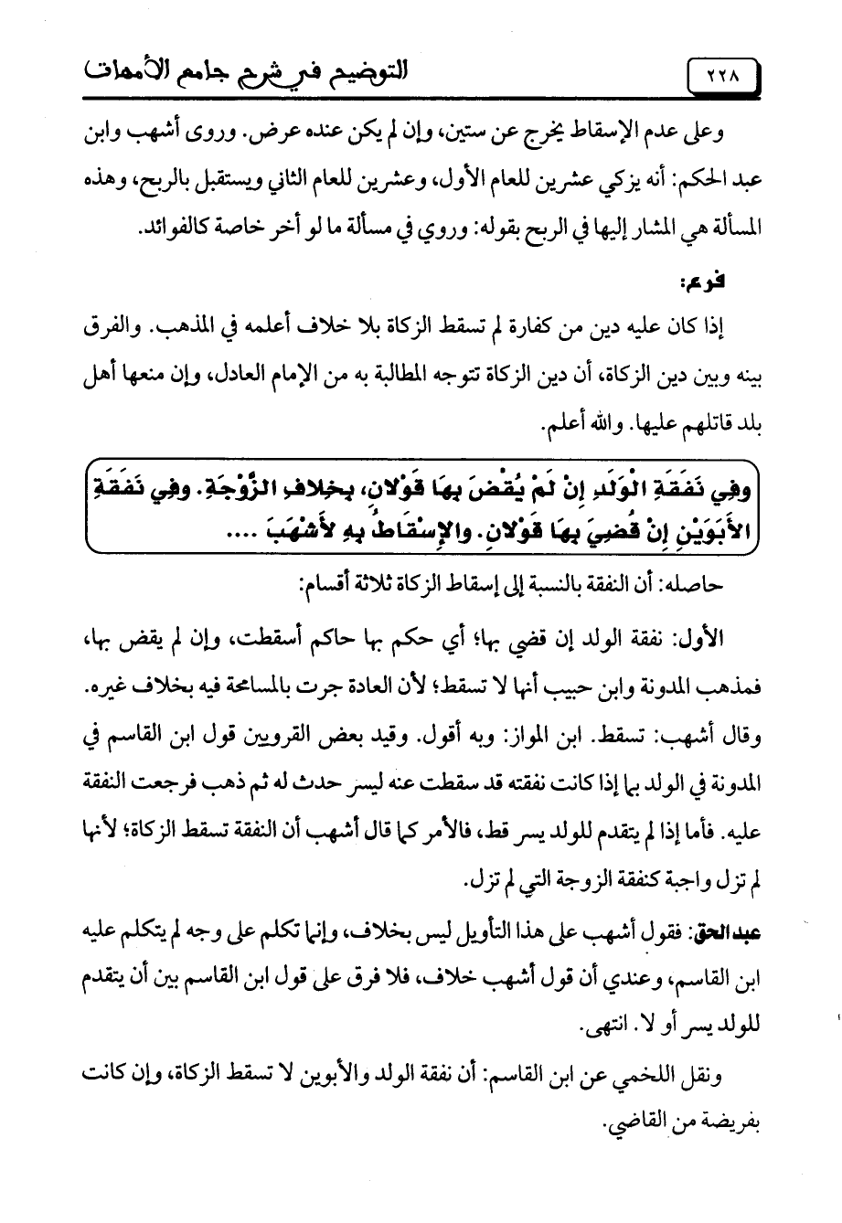 الأول: نفقة الولد إن قضي بها؛ أي حكم بها حاكم أسقطت، وإن لم يقض بها، فمذهب المدونة وابن حبيب أنها لا تسقط؛ لأن العادة جرت بالمسامحة فيه بخلاف غيره. وقال أشهب: تسقط. ابن المواز: وبه أقول. وقيد بعض القرويين قول ابن القاسم في المدونة في الولد بما إذا كانت نفقته قد سقطت عنه ليسر حدث له ثم ذهب فرجعت النفقة عليه. فأما إذا لم يتقدم للولد يسر قط، فالأمر كما قال أشهب أن النفقة تسقط الزكاة؛ لأنها لم تزل واجبة كنفقة الزوجة التي لم تزل.
