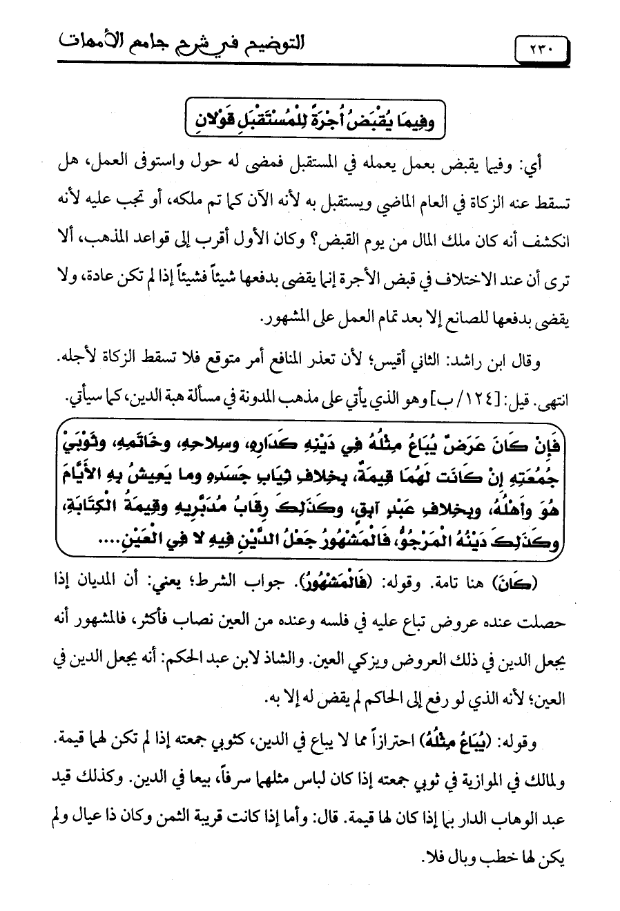 وقال ابن راشد: الثاني أقيس؛ لأن تعذر المنافع أمر متوقع فلا تسقط الزكاة لأجله انتهى. قيل: [124/ ب] وهو الذي يأتي على مذهب المدونة في مسألة هبة الدين، كما سيأتي.